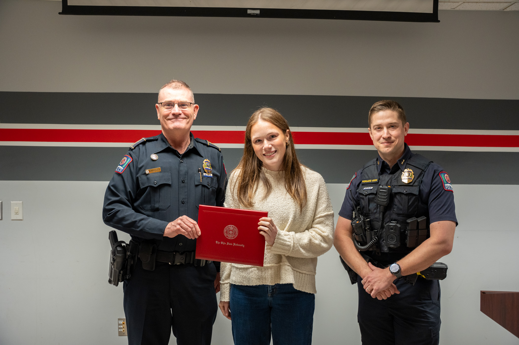 The Citizen Award was presented to Katie Mold, a second-year nursing student, for her quick and decisive actions during a medical emergency at an Ohio State basketball game. When an OSUPD officer experienced a medical emergency on the court, Mold stepped in to provide immediate medical assistance until additional help arrived. “Katie’s actions demonstrate courage, compassion and readiness to serve others,” Jeffrey said. “Her willingness to step forward in a critical moment made a real difference.”